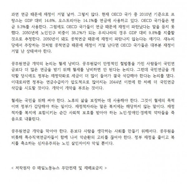 - 다음글[연속기고-공무원연금 개혁, 사회적 대화가 답이다] 공무원연금 함부로 차지 마라 14.09.25