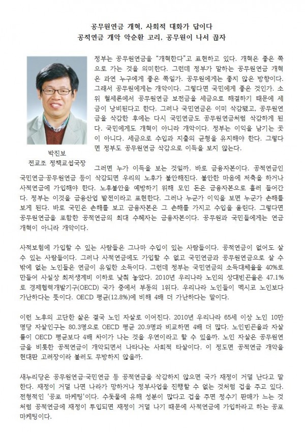 [연속기고-공무원연금 개혁, 사회적 대화가 답이다] 공적연금 개악 악순환 고리, 공무원이 나서 끊자
